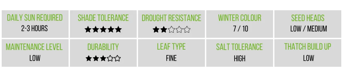 It performs best in full sun and suits homeowners who want a refined, tidy lawn that stays looking sharp year-round. Augusta can be kept longer for a soft, lush finish or maintained shorter for a more golf course-style look, giving you flexibility depending on how you want your lawn to present.